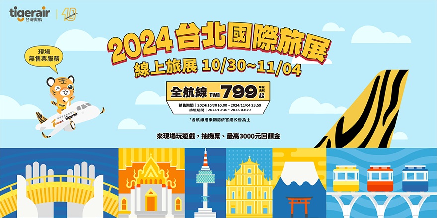 全台規模最大的「2024ITF台北國際旅展」即將於11月1日至4日在南港展覽館盛大舉辦,台灣虎航特別推出全航線單程未稅NT$799起的線上旅展優惠促銷價外,更歡迎民眾親自來旅展現場攤位同歡,只要參與旅展現場的遊戲,即有機會抽中免費機票等超多豐富好禮。